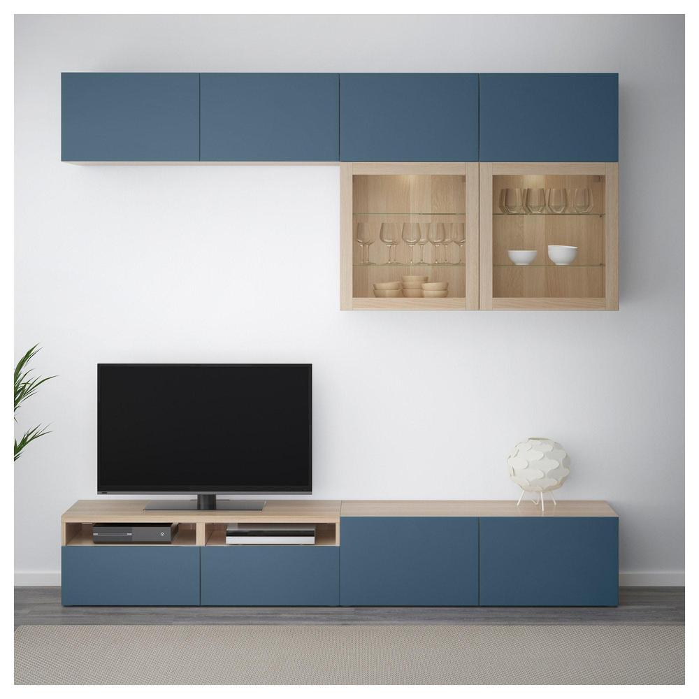БЕСТО Шкаф для ТВ, комбин/стеклян дверцы - под беленый дуб Вальвикен/темно-синий прозрачное стекло, направляющие ящика,нажимные