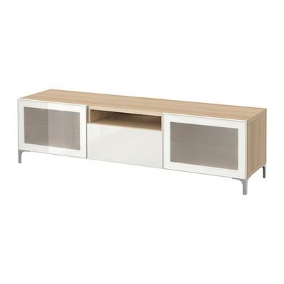 БЕСТО Тумба под ТВ - под беленый дуб/Сельсвикен глянцевый/белый матовое стекло, направляющие ящика,нажимные