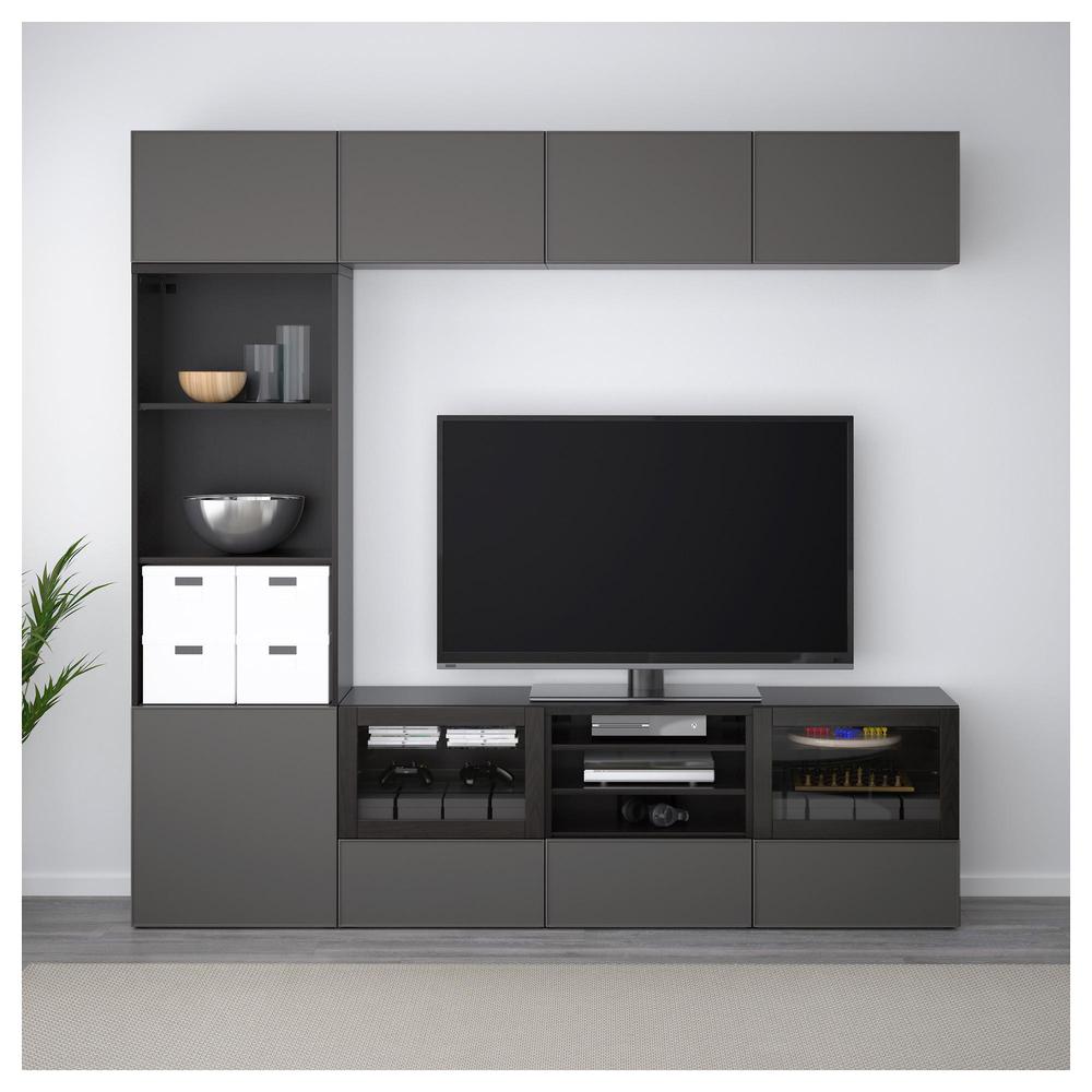 БЕСТО Шкаф для ТВ, комбин/стеклян дверцы - черно-коричневый Грундсвикен/темно-серый прозрачное стекло, направляющие ящика,нажимные