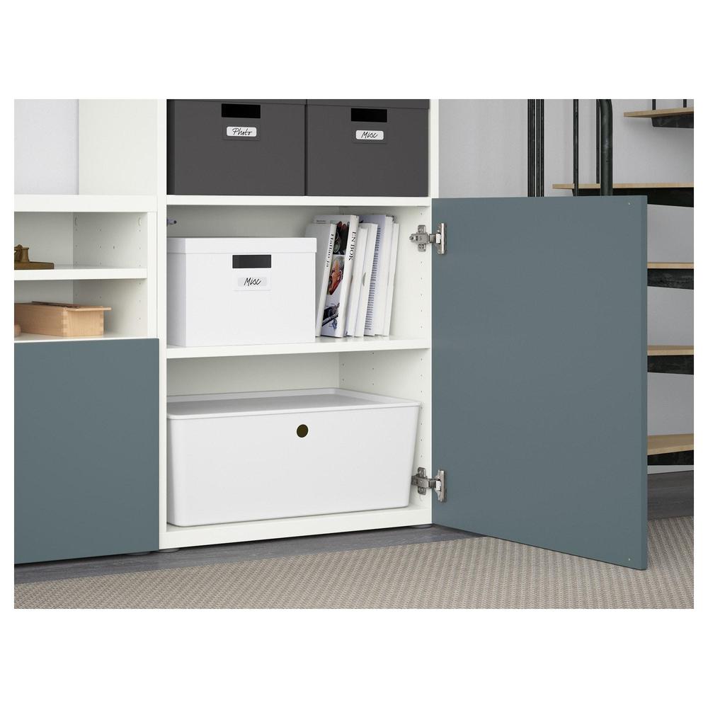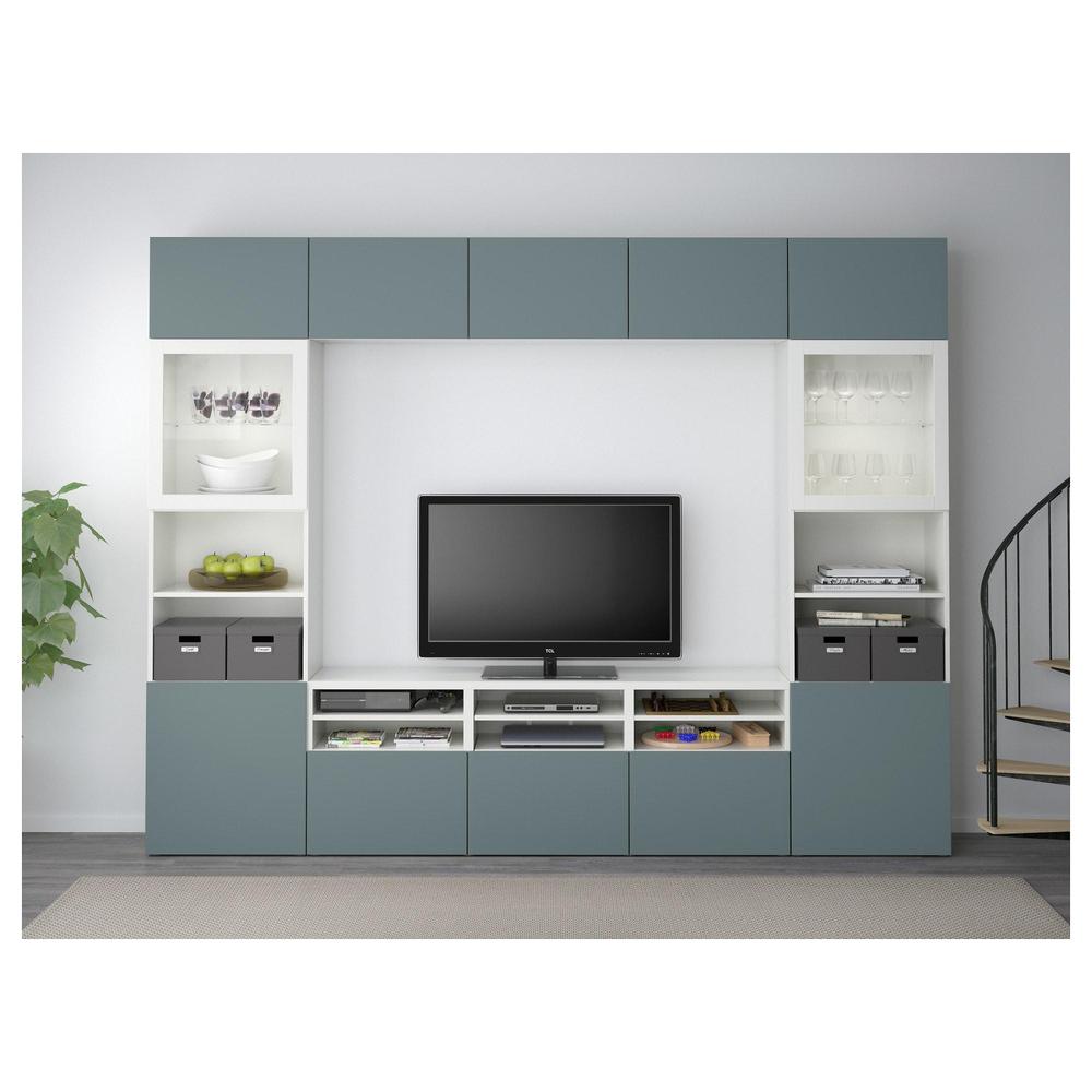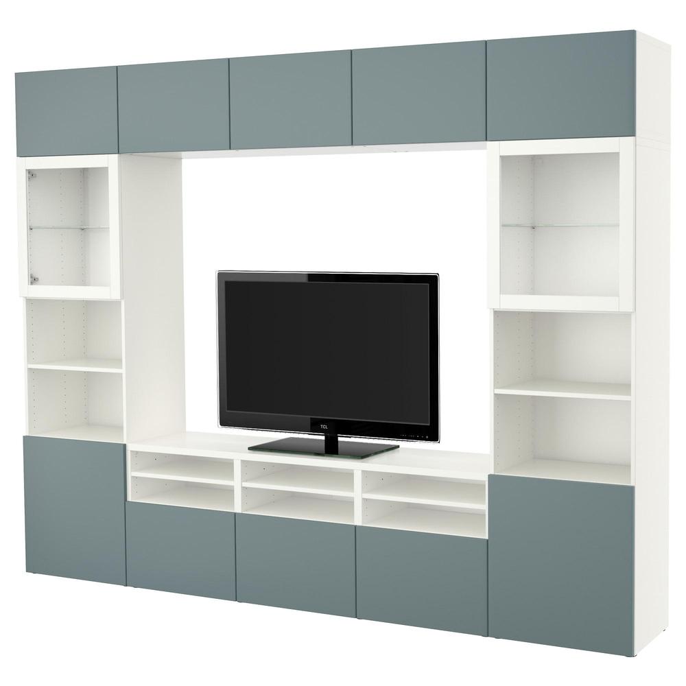 БЕСТО Шкаф для ТВ, комбин/стеклян дверцы - белый/Вальвикен серо-бирюзовый, прозрачное стекло, направляющие ящика,нажимные