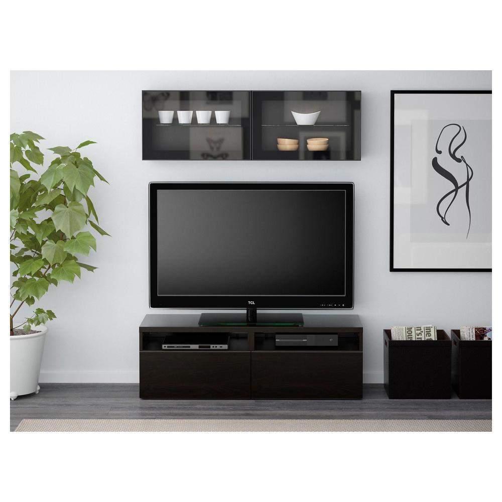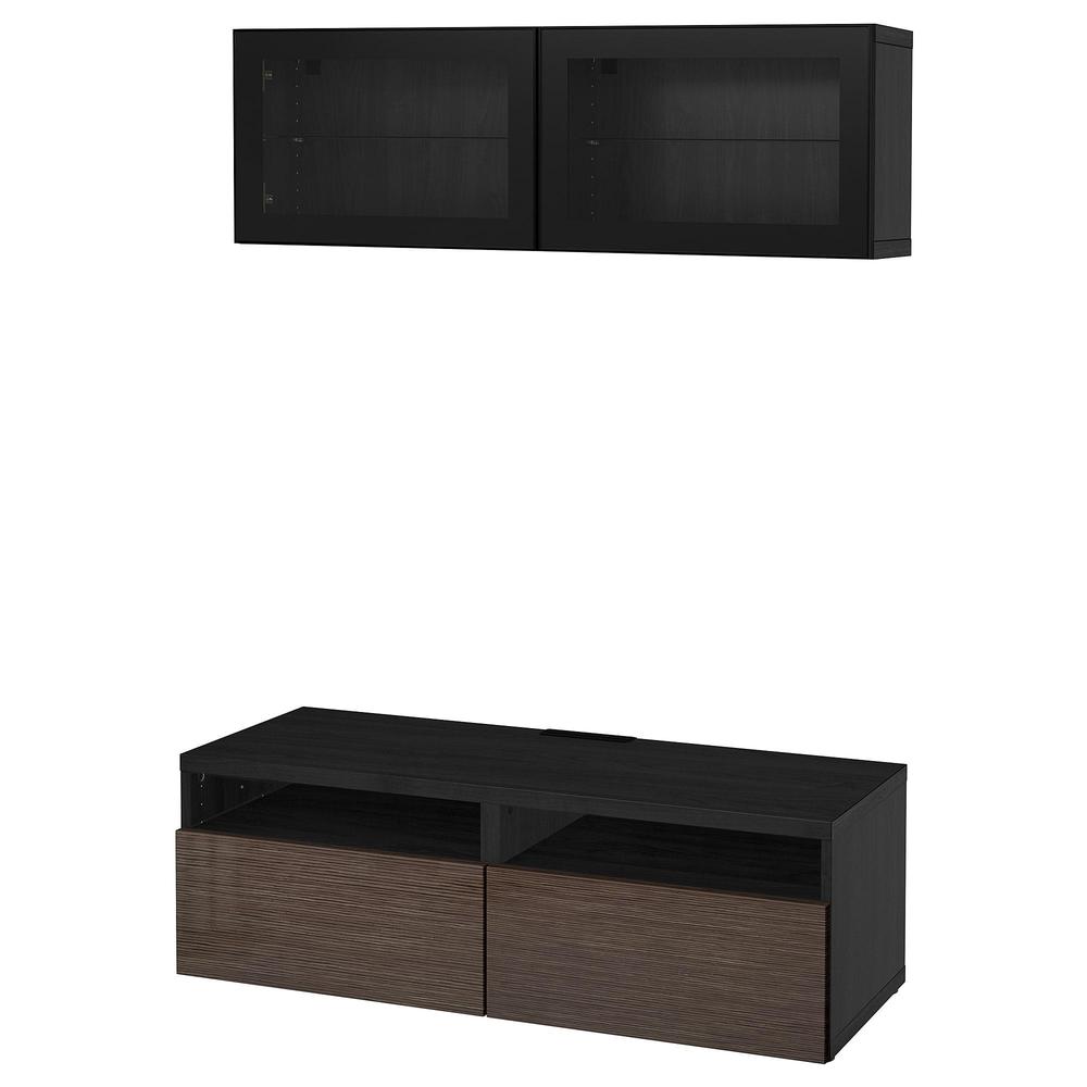 БЕСТО Шкаф для ТВ, комбин/стеклян дверцы - черно-коричневый/Сельсвикен глянцевый/коричневый прозрач стекло, направляющие ящика, плавно закр