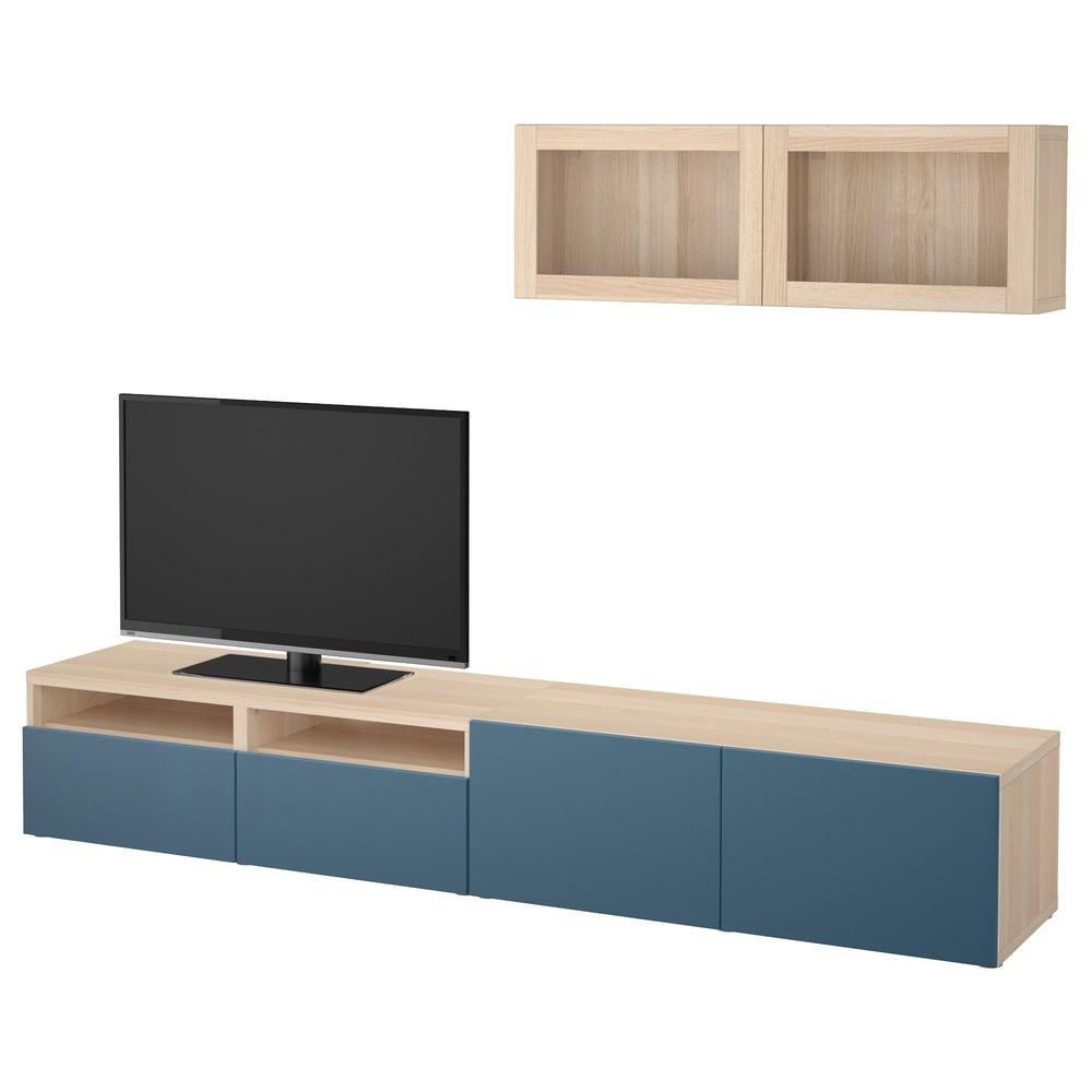 БЕСТО Шкаф для ТВ, комбин/стеклян дверцы - под беленый дуб Вальвикен/темно-синий прозрачное стекло, направляющие ящика,нажимные