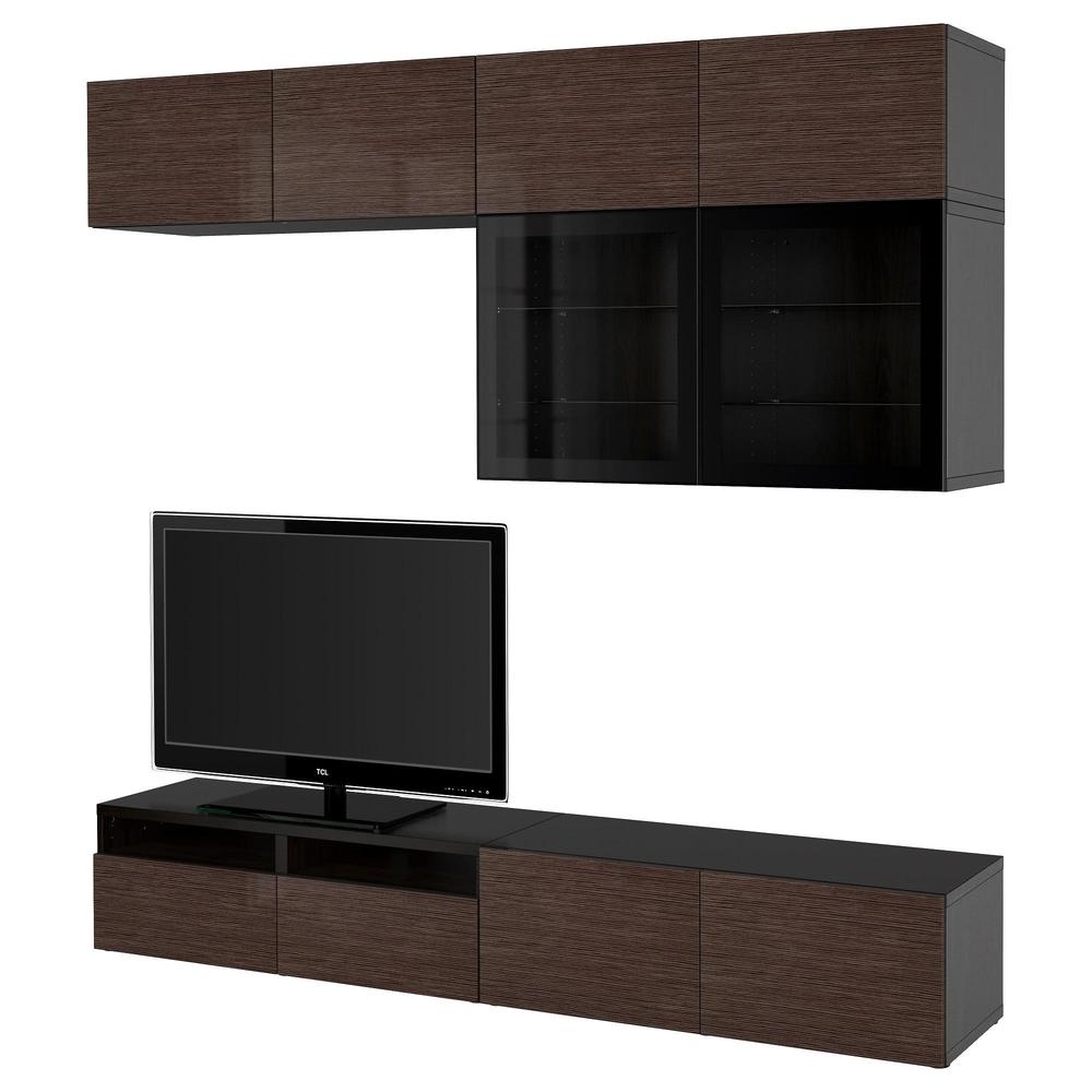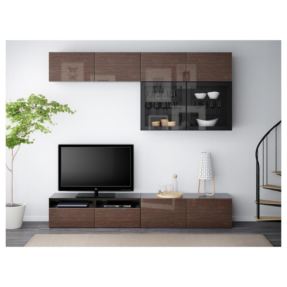 БЕСТО Шкаф для ТВ, комбин/стеклян дверцы - черно-коричневый/Сельсвикен глянцевый/коричневый прозрач стекло, направляющие ящика,нажимные