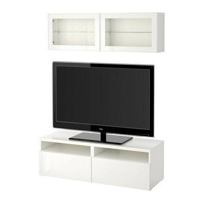 БЕСТО Шкаф для ТВ, комбин/стеклян дверцы - белый/Сельсвикен глянцевый/белый прозрачное стекло, направляющие ящика,нажимные