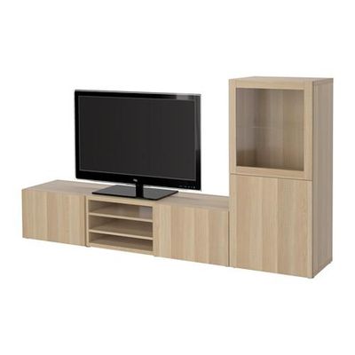 БЕСТО Шкаф для ТВ, комбин/стеклян дверцы - Лаппвикен/Синдвик под беленый дуб, прозрачное стелко, направляющие ящика, плавно закр