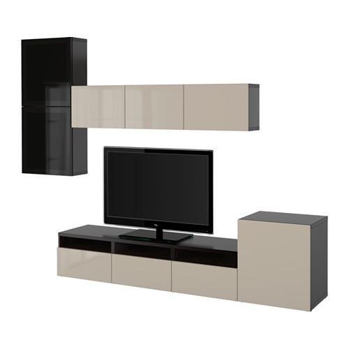 БЕСТО Шкаф для ТВ, комбин/стеклян дверцы - черно-коричневый/Сельсвикен глянцевый/бежевый/дымчатое стекло, направляющие ящика, плавно закр