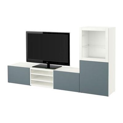 БЕСТО Шкаф для ТВ, комбин/стеклян дверцы - белый/Вальвикен серо-бирюзовый, прозрачное стекло, направляющие ящика,нажимные