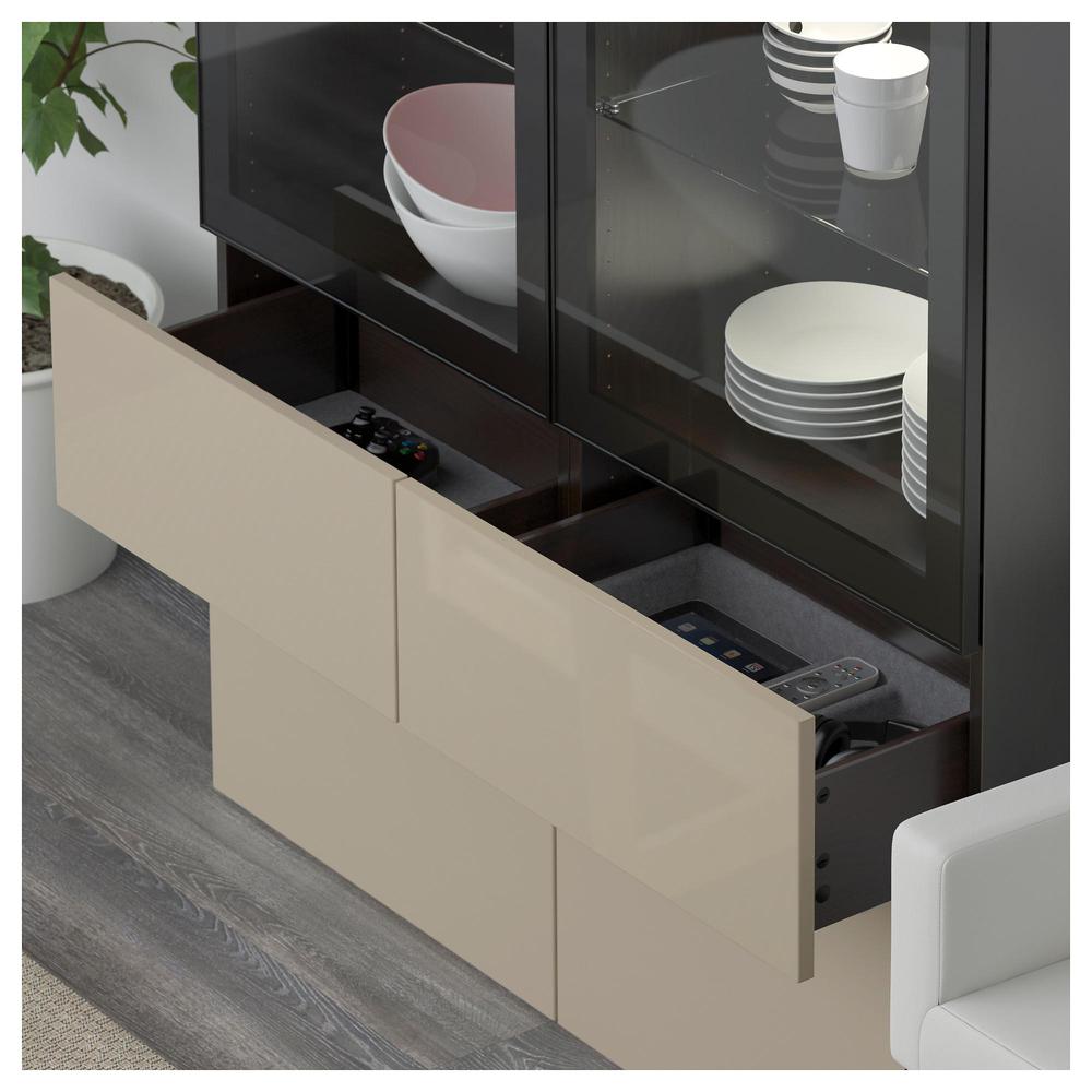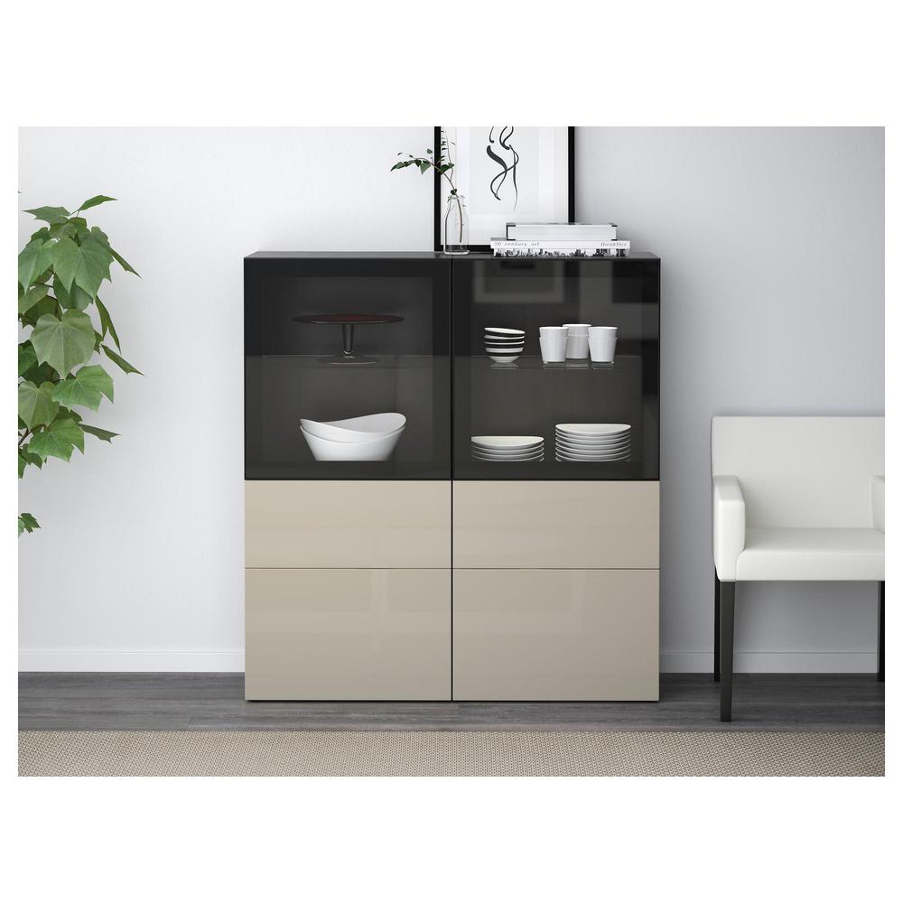 БЕСТО Комбинация д/хранения+стекл дверц - черно-коричневый/Сельсвикен глянцевый/бежевый прозрачное стекло, направляющие ящика, плавно закр