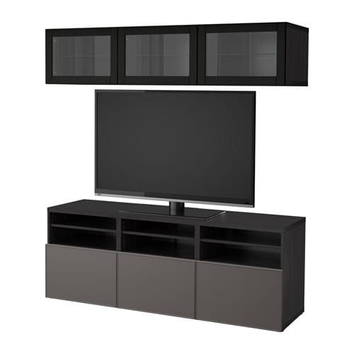 БЕСТО Шкаф для ТВ, комбин/стеклян дверцы - черно-коричневый Грундсвикен/темно-серый прозрачное стекло, направляющие ящика,нажимные