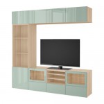 БЕСТО Шкаф для ТВ, комбин/стеклян дверцы - под беленый дуб Сельсвикен/глянцевый/серо-зеленый светлый прозрачное стекло, направляющие ящика, плавно закр