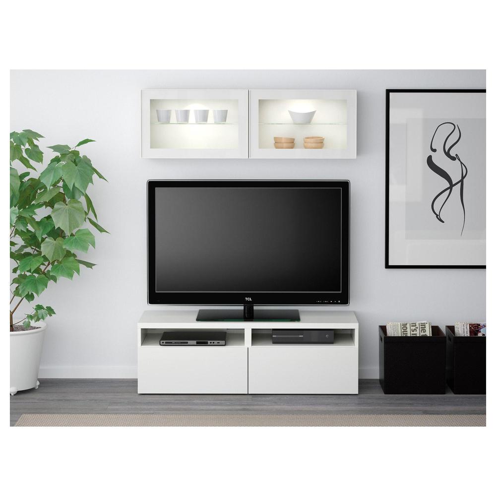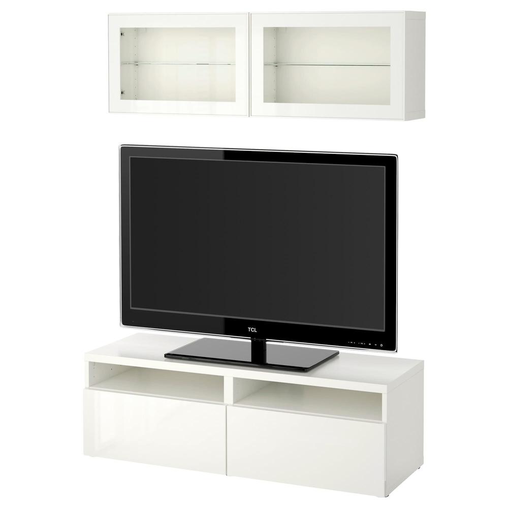 БЕСТО Шкаф для ТВ, комбин/стеклян дверцы - белый/Сельсвикен глянцевый/белый прозрачное стекло, направляющие ящика,нажимные