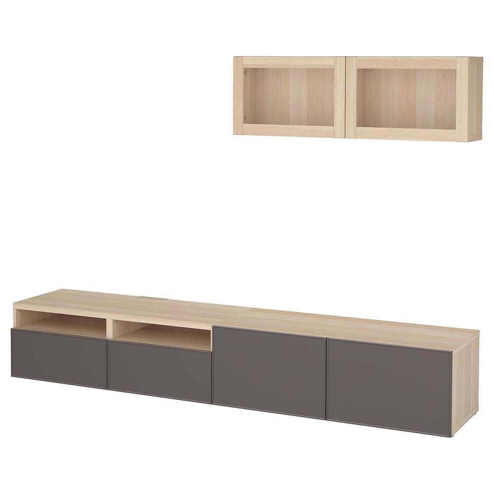 БЕСТО Шкаф для ТВ, комбин/стеклян дверцы - под беленый дуб Грундсвикен/темно-серый прозрачное стекло, направляющие ящика, плавно закр