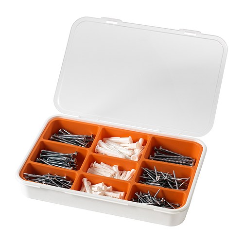 В набор входит: различные шурупы и дюбели для дерева, штукатурки, бетона и кирпича. |