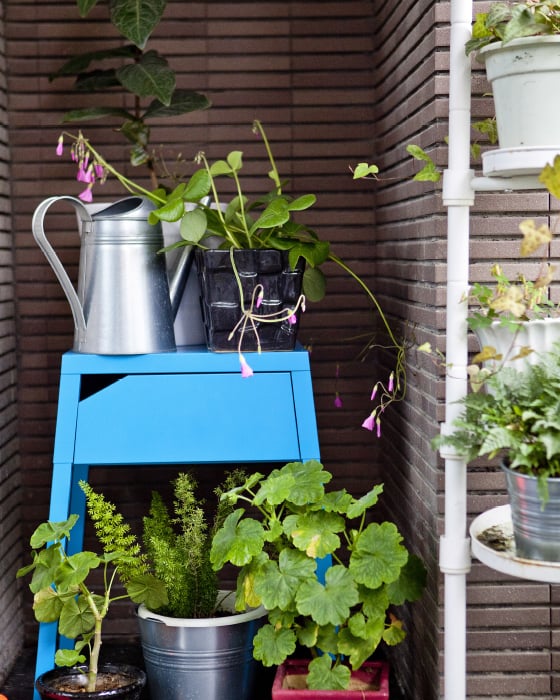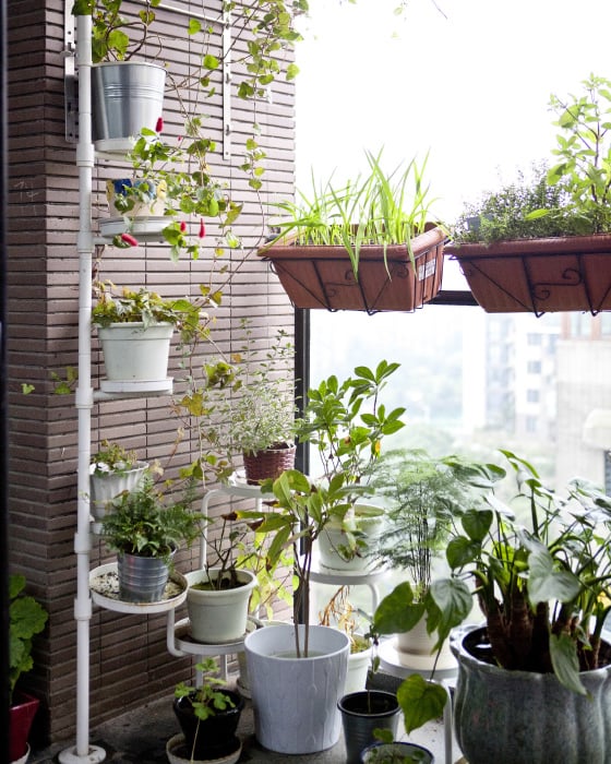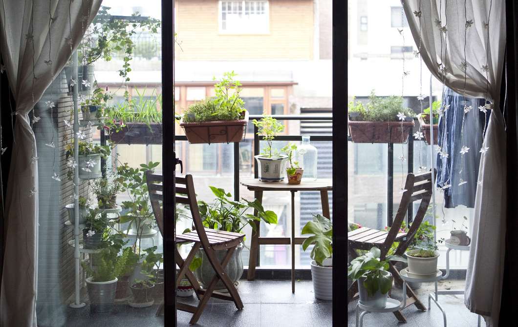 Как создать оазис на городском балконе? Если балкон небольшой, то растения нужно располагать там, чтобы они росли вверх, а не вширь. Растения, которые растут вверх, имеют достаточно места для свободного роста, и создадут ощущение изобилия. Чтобы вырастить живой навес, используйте навесную решетку. По законам дизайна, если вы используете мебель, аксессуары и растения ярких цветов, то темный балкон можно сделать светлее и ярче. Для хранения необходимых вещей можно использовать приставной столик, который займет минимум места.