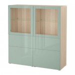 БЕСТО Комбинация д/хранения+стекл дверц - под беленый дуб Сельсвикен/глянцевый/серо-зеленый светлый прозрачное стекло